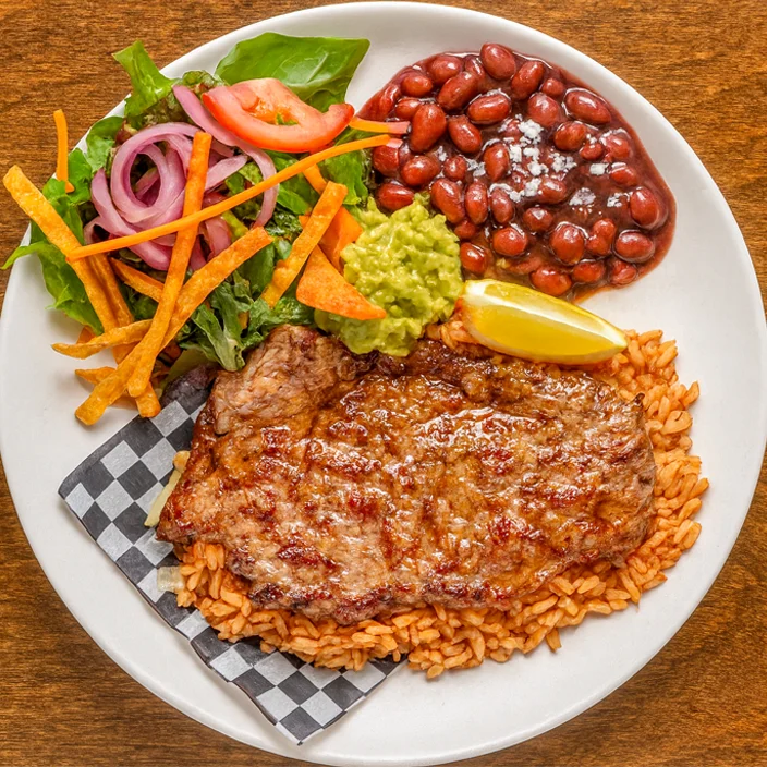 Fried tortillas with black beans, pico de gallo, cheese, guacamole and sour cream, topped with our succulent salsa and a choice of meat.