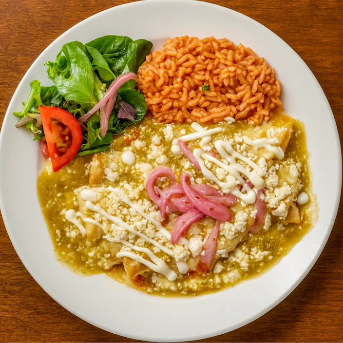 Four corn tortillas (chicken or veg) with green tomatillo-chile sauce; served with rice, salad, cheese & crema.