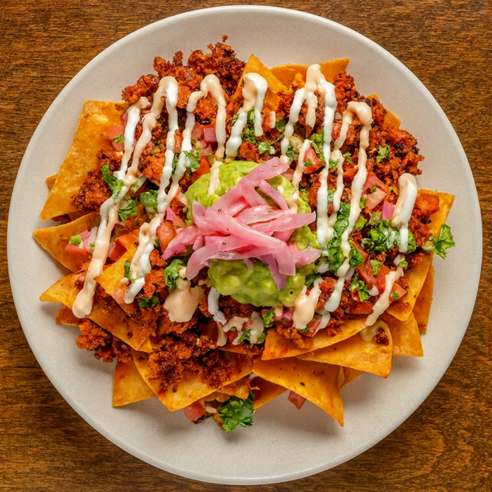 Crispy tortillas with black beans, pico de gallo, cheese, guacamole & sour cream, bathed in our sauce; add a protein.